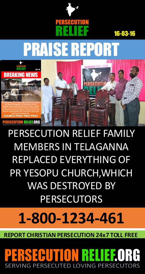 പാസ്ടർ YESOUYPU ഇന്റെ ആരാധന സ്ഥലം ( Kothagudan village, in khammam District, Telangana ) സുവിശേഷ വിരോധികൾ തല്ലിത്തകർത്തു.അവിടെ ഉണ്ടായിരുന്ന furniture എല്ലാം തന്നെ നശിപ്പിച്ച ഇവർ ആരാധന നടത്തുന്ന സ്ഥലത്ത് കയറി കളിക്കുവാൻ തുടങ്ങി. കഴിഞ്ഞ രണ്ടു വർഷമായി ആരാധന നടത്തിക്കൊണ്ടിരുന്ന ഈ സ്ഥലത്ത് ഇനി പാസ്ടർ വരാൻ പാടില്ല എന്ന് ഭീഷണിപ്പെടുത്തുകയും ചെയ്തു.