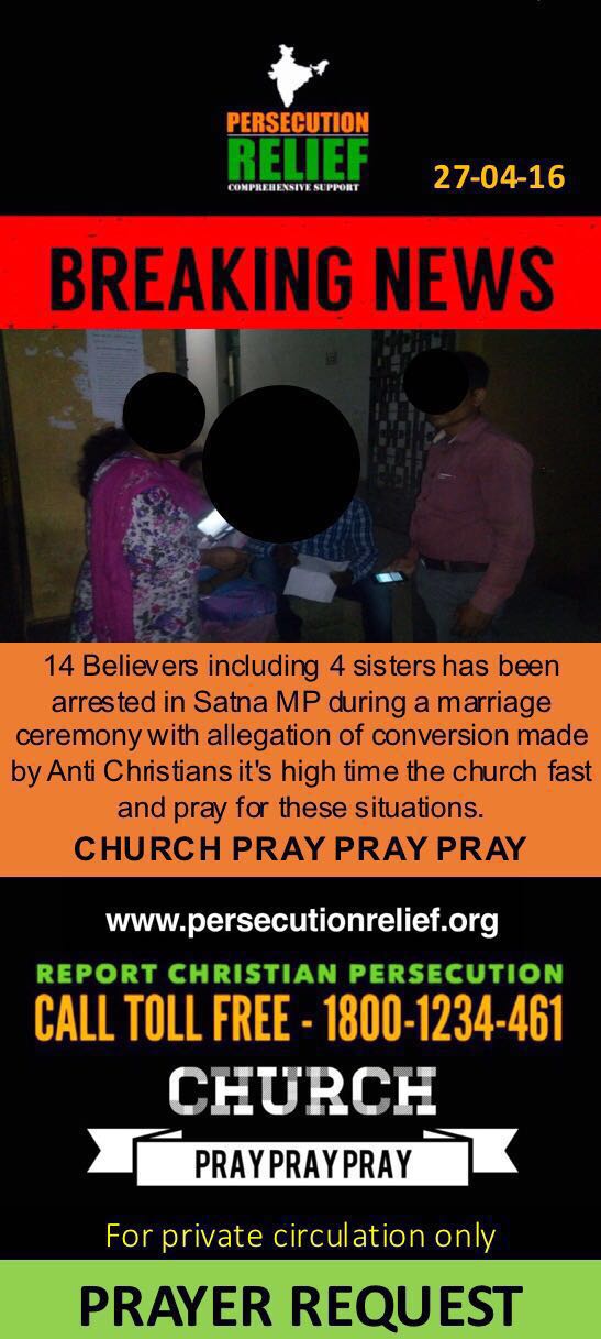 മധ്യപ്രദേശിലെ സാട്നയിൽ ഒരു വിവാഹ ശുശ്രൂഷ നടക്കുന്നതിനിടെ മതപരിവർത്തനം നടത്തുന്നു എന്നാ ആരോപണം ചുമത്തി 4 സ്ത്രീകൾ അടക്കം 14 വിശ്വാസികളെ അറസ്റ്റ് ചെയ്തു.