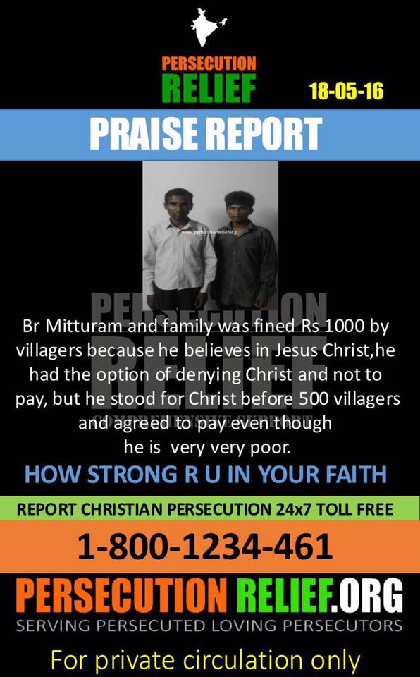 പാസ്ടർ വിജയ് ബഹദൂർ ഉത്തർ പ്രദേശിലെ ഒരു ഗ്രാമത്തിൽ (Jamua under district Jaunpur, UP) ആരാധന നടത്തുന്നതിടെ , ആരാധന തടസ്സപ്പെടുത്തുകയും ജനങ്ങളെ മതം മാറ്റുന്നു എന്ന് ആരോപിച്ചു പോലീസ് സ്ടഷനിലെയ്ക്ക് കൊണ്ട് പോകുകയും ചെയ്തു. FIR കൂടാതെ ഇവർ പുറത്തു വരേണ്ടതിനും ദൈവ ശക്തിയാൽ ഇവർ നിരയപ്പെടെണ്ടതിനും സഭ പ്രാർത്ഥിക്കുക.