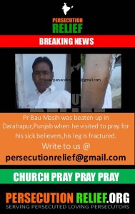 പാസ്ടർ Bau Masih പഞ്ചാബിലെ ദാരഹ്പുരിൽ സുവിശേഷ വിരോധികളുടെ ആക്രമണത്തിന് വിധേയനായി. ഇദ്ദേഹത്തിന്റെ കാലിനു ഒടിവുണ്ട്. സുഖമില്ലാതെ ഭാരപ്പെടുന്ന തന്റെ വിശ്വാസികളെ സന്ദർശിക്കുന്നതിനു ഇടയിലാണ് ആക്രമണം നടന്നത്.