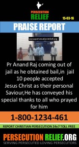 പാസ്ടർ ആനന്ദ് രാജിന് ജാമ്യം ലഭിച്ചു. ജയിലിൽ 10 ഓളം ആളുകൾ യേശുക്രിസ്തുവിനെ രക്ഷകനായി സ്വീകരിച്ചു. പ്രാർത്ഥനയിൽ തന്നെ ഓർത്ത എല്ലാവർക്കും ഇദ്ദേഹം പ്രത്യേകം നന്ദി അറിയിച്ചു.